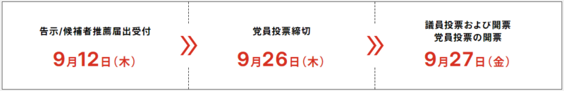 自民党総裁選、告示/候補者推薦届出受付が9月12日、党員投票締め切り9月26日、開票が9月27日。