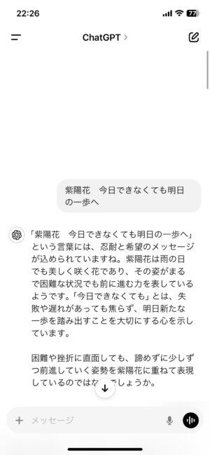 ”「紫陽花 今日できなくても明日の一歩へ」という言葉には、忍耐と希望のメッセージが込められていますね。紫陽花は雨の日でも美しく咲く花であり、その姿がまるで困難な状況でも前に進む力を表しているようです。「今日できなくても」とは、失敗や遅れがあっても焦らず、明日新たな一歩を踏み出すことを大切にする心を示しています。