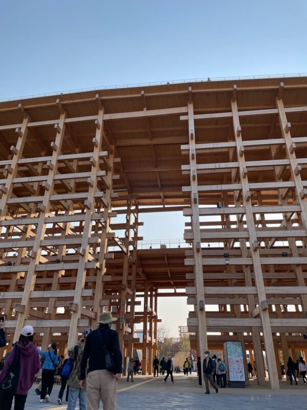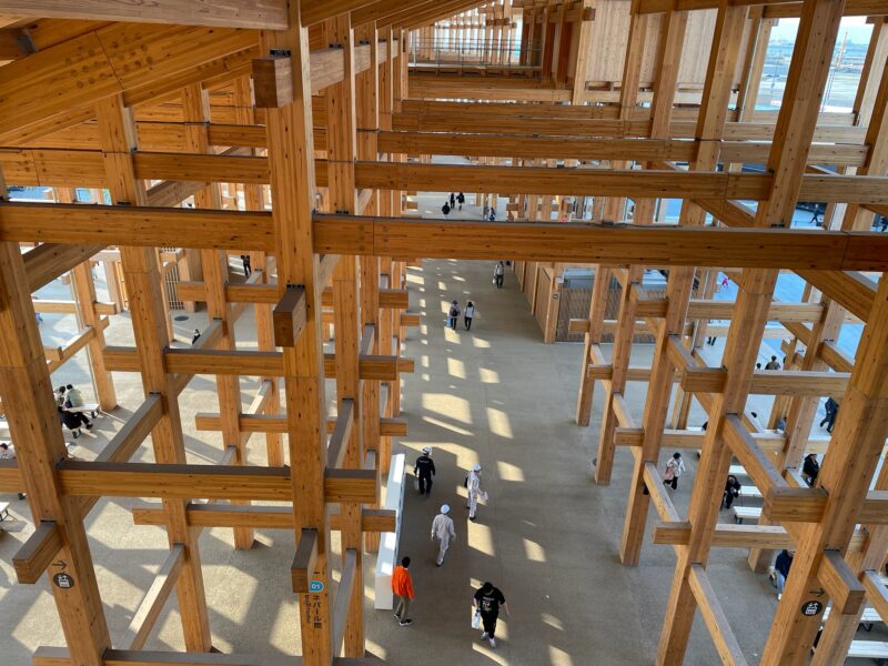 大屋根リングは日本の神社仏閣などの建築に使用されてきた伝統的な貫(ぬき)接合に、現代の工法を加えて建築しているとのこと。