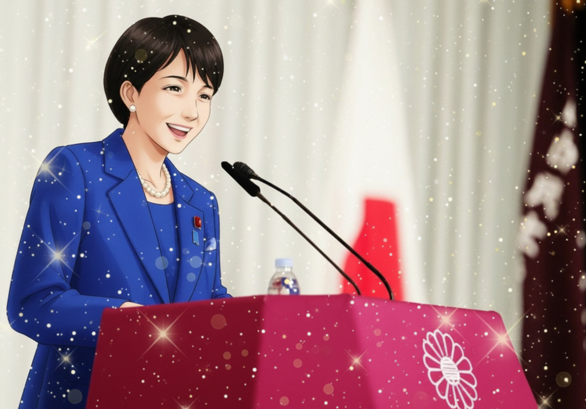 総裁就任の際にお召しになられていたロイヤルブルーのスーツ姿の高市総理の映像はなめらかにしゃべる。
