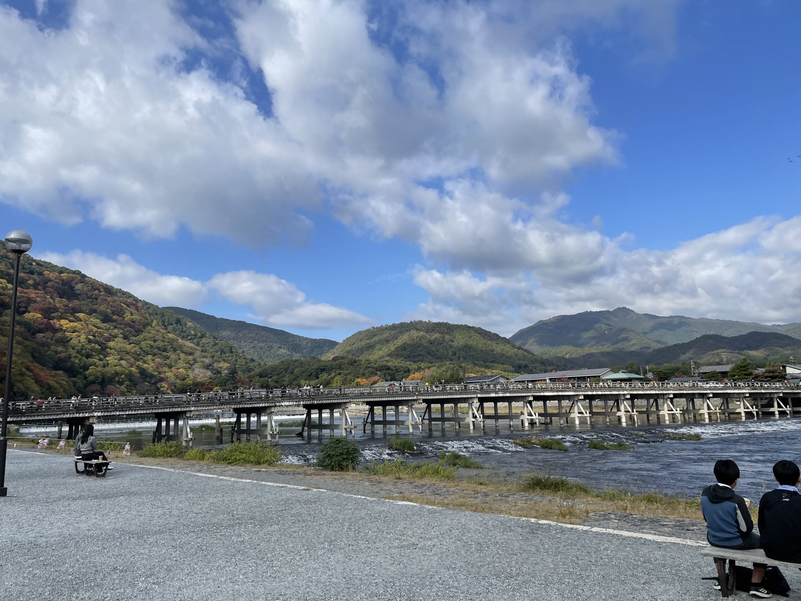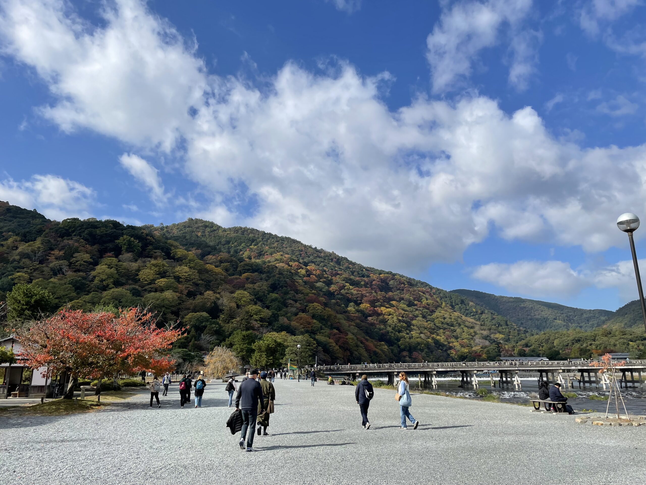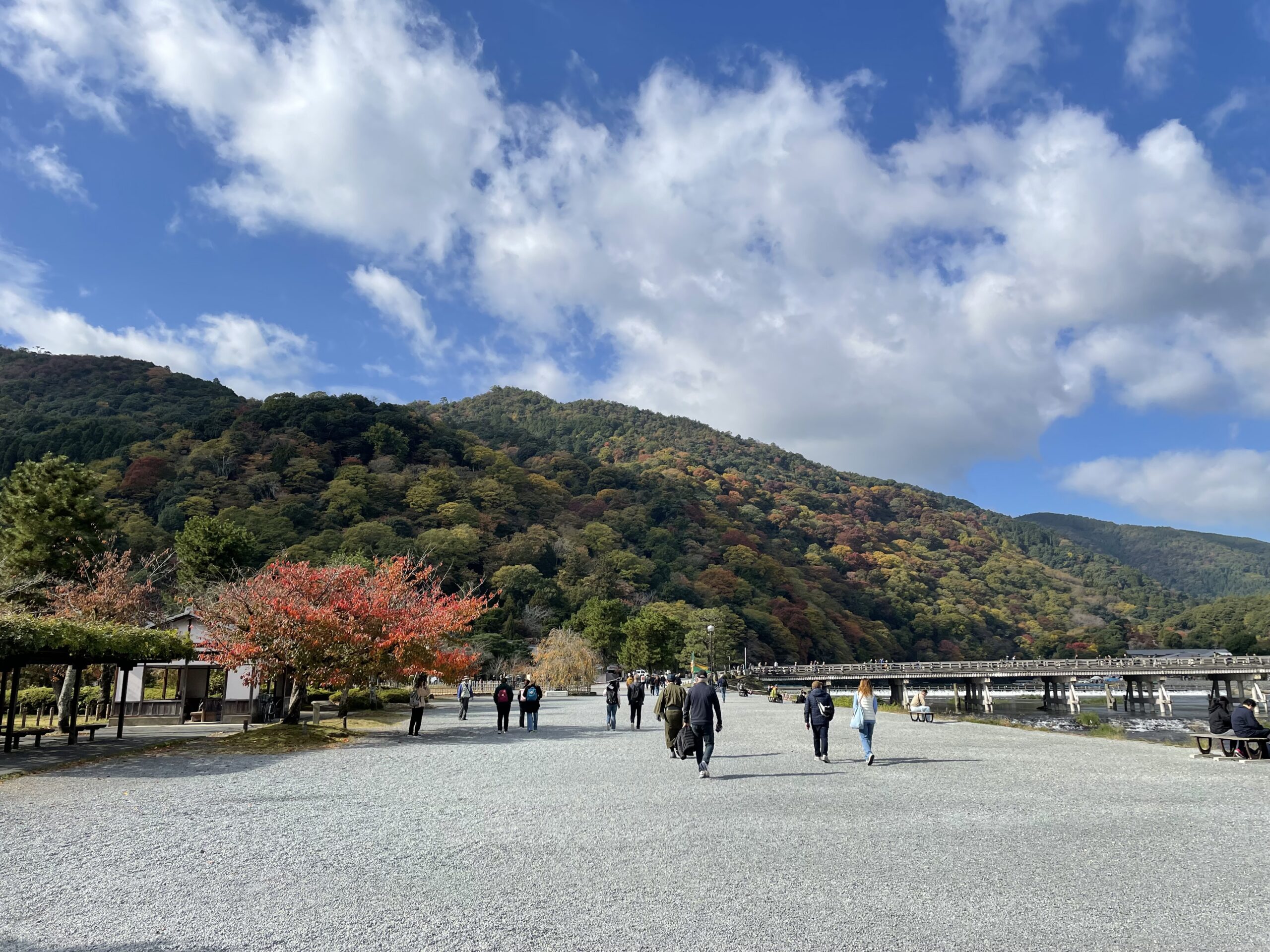 朝の渡月橋周辺。